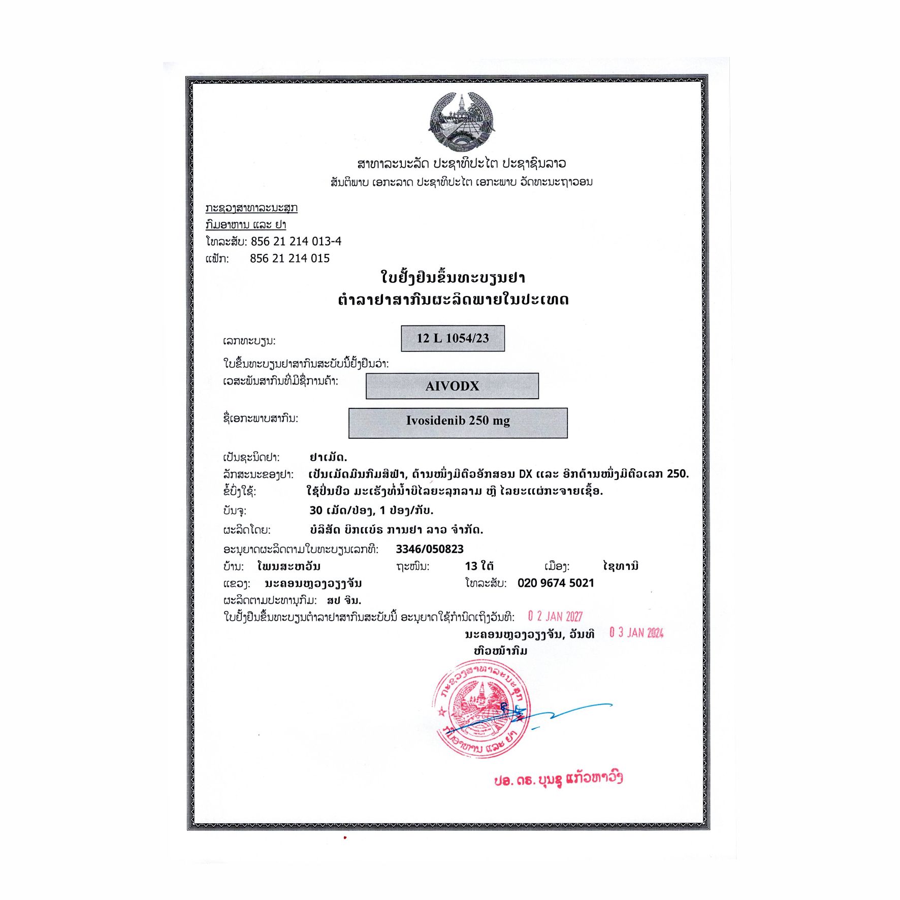 AIVODX 是一种异柠檬酸脱氢酶1(IDH1)抑制剂,适用于经FDA批准的检测方法检测出易感IDH1突变的患者:
