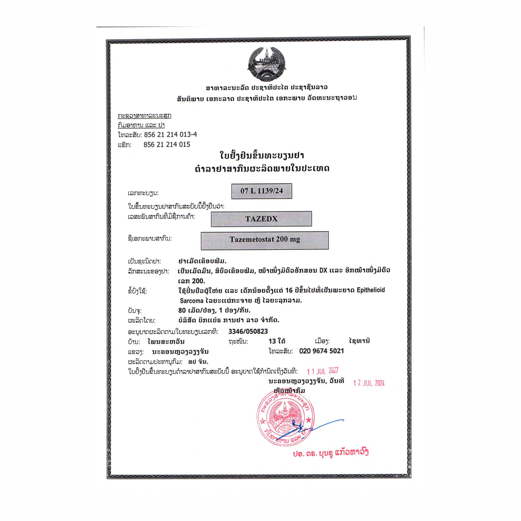名称:他泽司他片