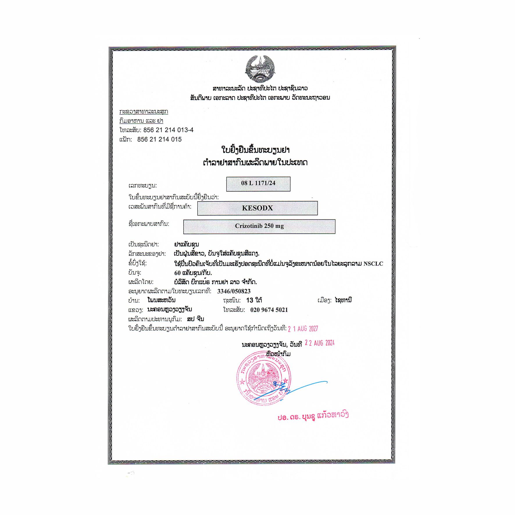 KESODX是一种激酶抑制剂,用于治疗经FDA批准的检测方法检测为间变性淋巴瘤激酶(ALK)或ROS1阳性的转移性非小细胞肺癌(NSCLC)患者。