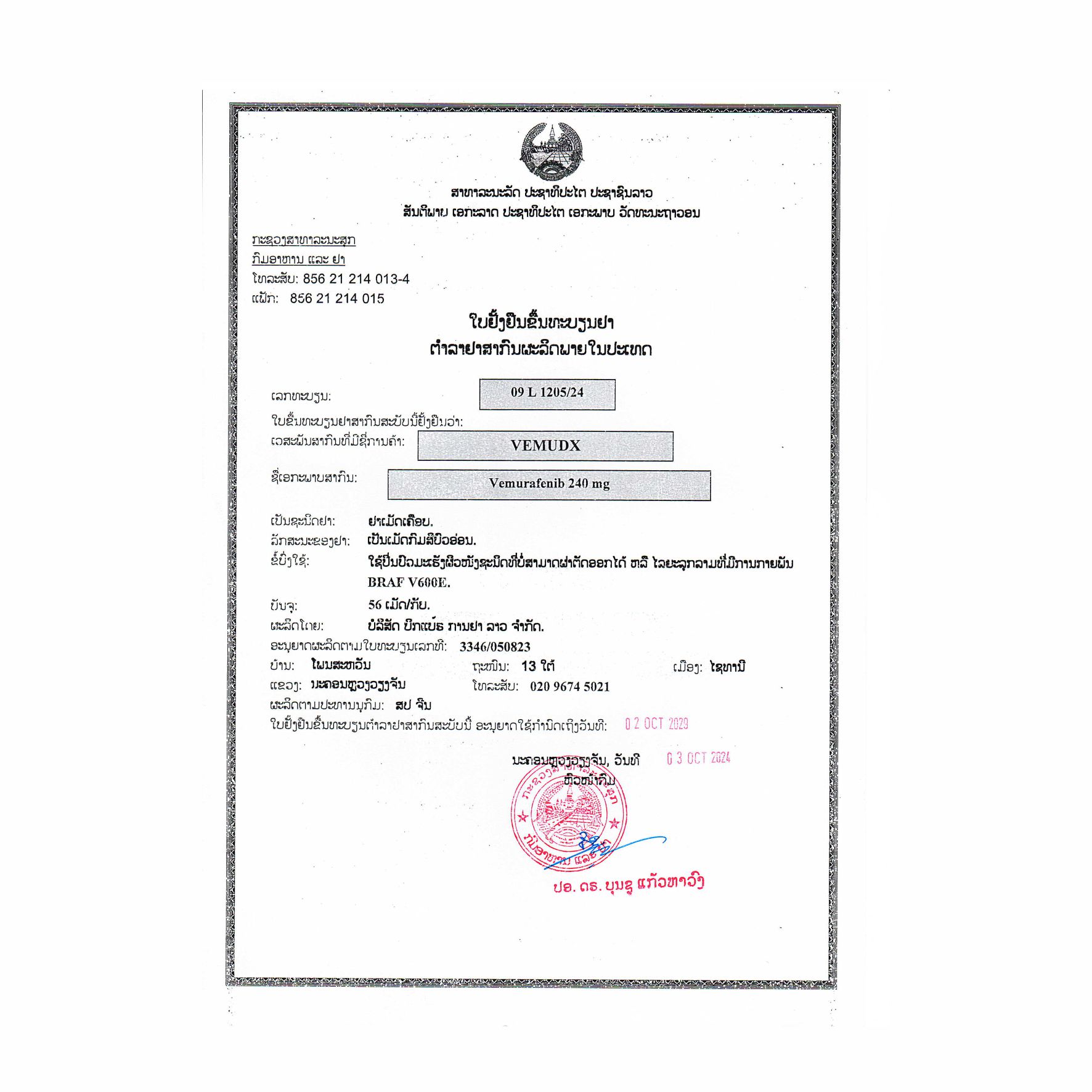 VEMUDX是一种激酶抑制剂,适用于治疗经美国食品药品监督管理局批准的检测方法检测为BRAF V600E突变的不可切除或转移性黑色素瘤患者。